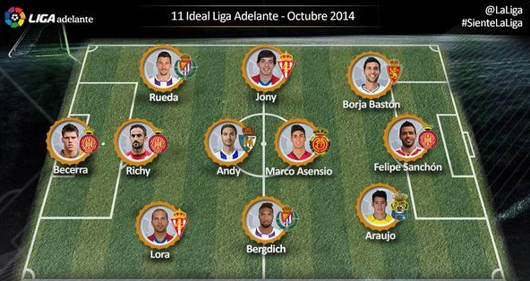 El próximo rival de la Unión Deportiva Las Palmas, el Girona, tiene a varios de sus futbolistas dentro de esta selección ideal. El portero Isaac Becerra, el central Richy y el peligroso delantero Felipe Sanchón están en esta lista. Lora y Rueda, defensas de Sporting de Gijon y Real Valladolid, respectivamente, completan la defensa ideal. Andy, el talentoso Marco Asensio, Jony y Bergdich forman el centro del campo mientras que la delantera el delantero del Zaragoza, Borja Bastón, termina el once.