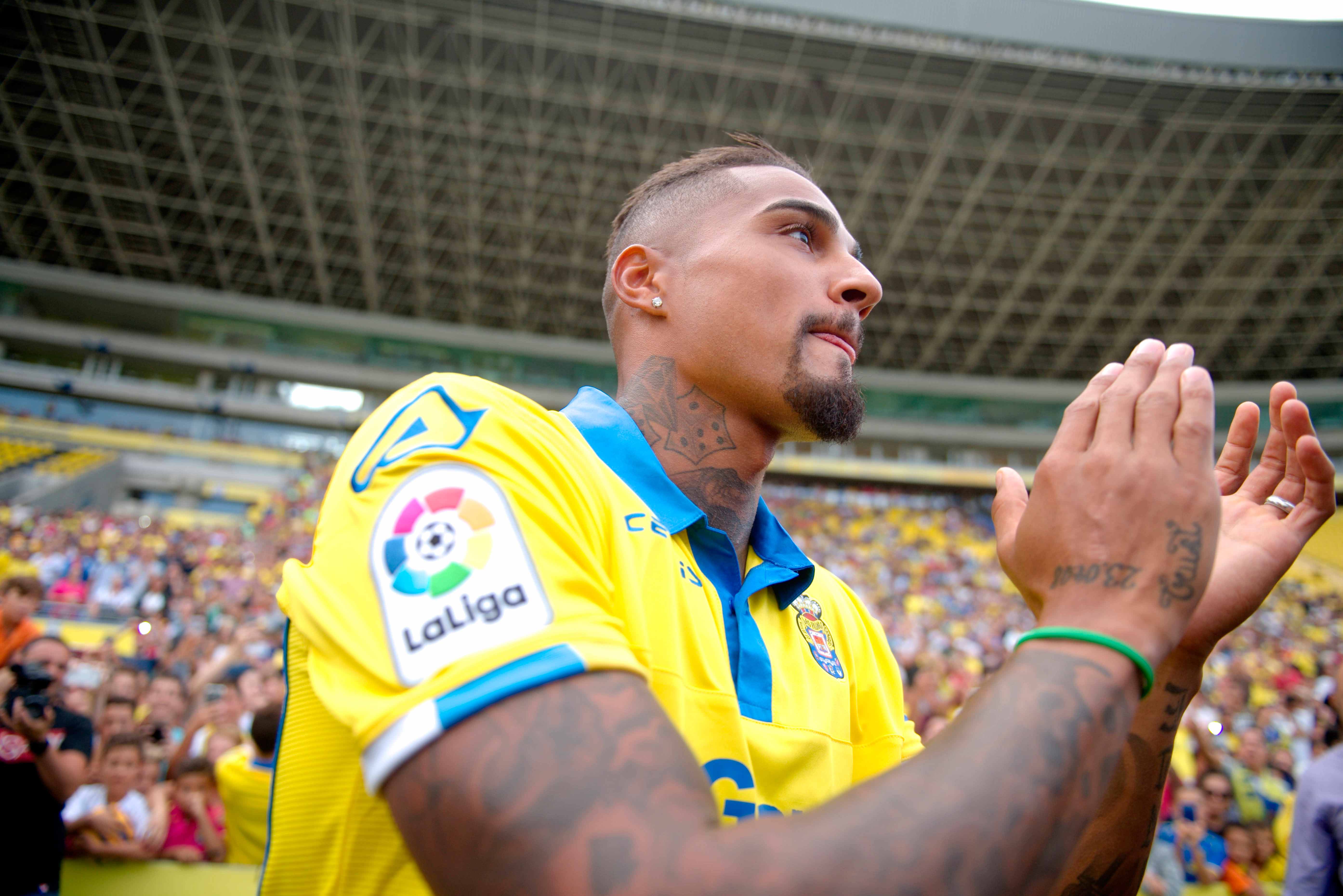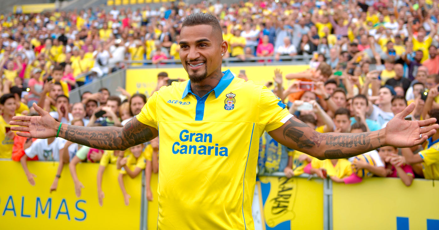 Kevin-Prince Boateng fue presentado este martes como nuevo jugador de la Unión Deportiva Las Palmas. Toni Cruz, director deportivo; Luis Helguera, secretario técnico; y Juan Carlos Valerón, Capitán de Honor, fueron los cicerones de la presentación en un Estadio de Gran Canaria donde esperaban numerosos aficionados. También se dejó ver posteriormente el presidente Miguel Á