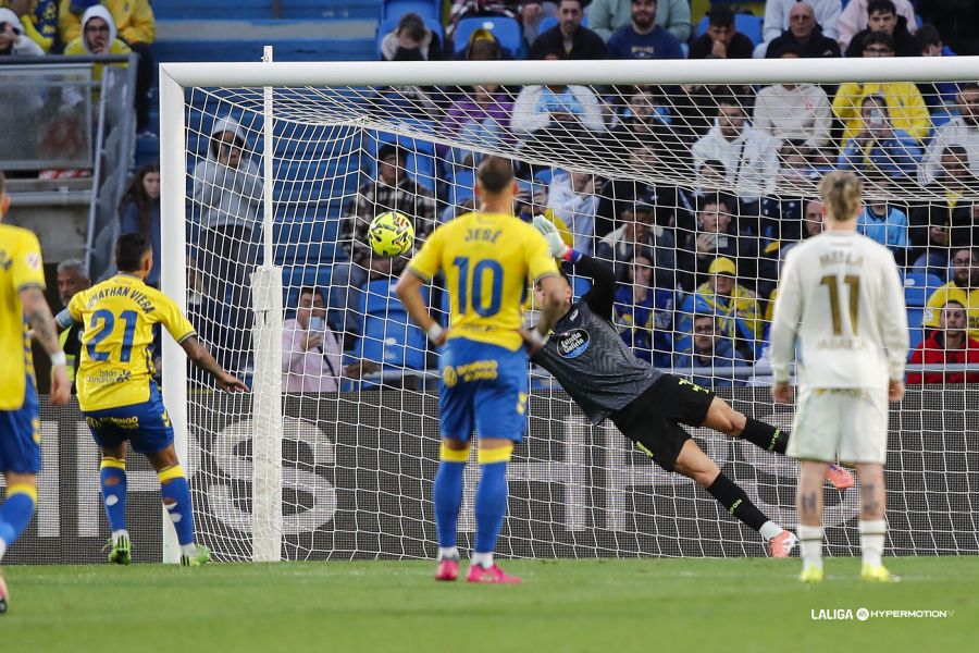 Aquel día, Jonathan Viera estrelló el balón en el larguero de la portería defendida por Alfonso Herrero. Las Palmas ya iba perdiendo 0-2 con dos acciones desafortunadas de Raúl Fernández. Este sábado, Álvaro Fernández realizó una parada espectacular para evitar el gol del capitán del representativo, que marcó su último gol amarillo desde los once metros.