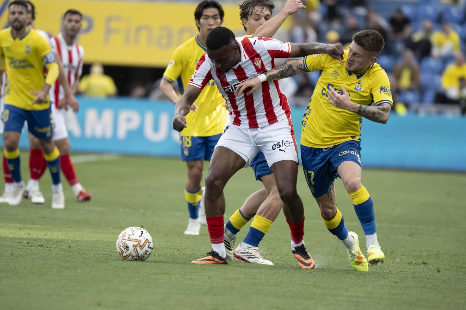 El lateral asturiano de la Unión Deportiva Las Palmas completó un buen partido en el lateral diestro y fue uno de los líderes del equipo amarillo contra el Sporting.